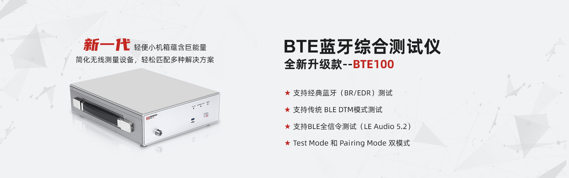BTE100+是由中承科技獨立自主研發(fā)的新一代藍(lán)牙射頻協(xié)議綜測儀,支持藍(lán)牙設(shè)備配對信令模式下的功率、頻偏、調(diào)制、接收靈敏度、吞吐量等射頻指標(biāo)精準(zhǔn)測試,支持多種藍(lán)牙協(xié)議版本的深度解析及實時IQ數(shù)據(jù)捕獲。